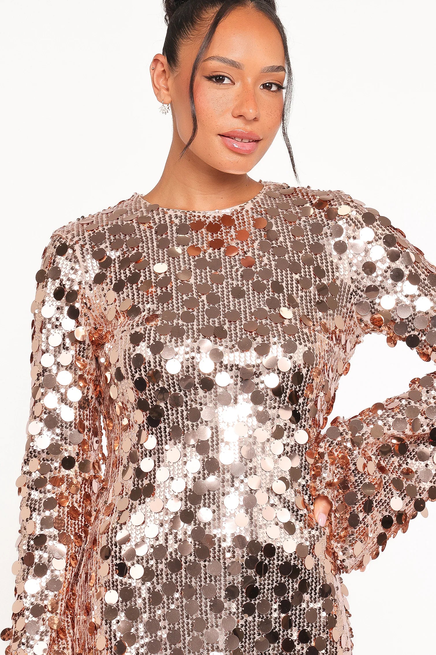 Prepare to light up the night in the Electra Long Sleeve Mini Dress in Gold. This stunning piece is designed to make a statement, featuring all-over sequin fabrication that catches the light with every move you make.