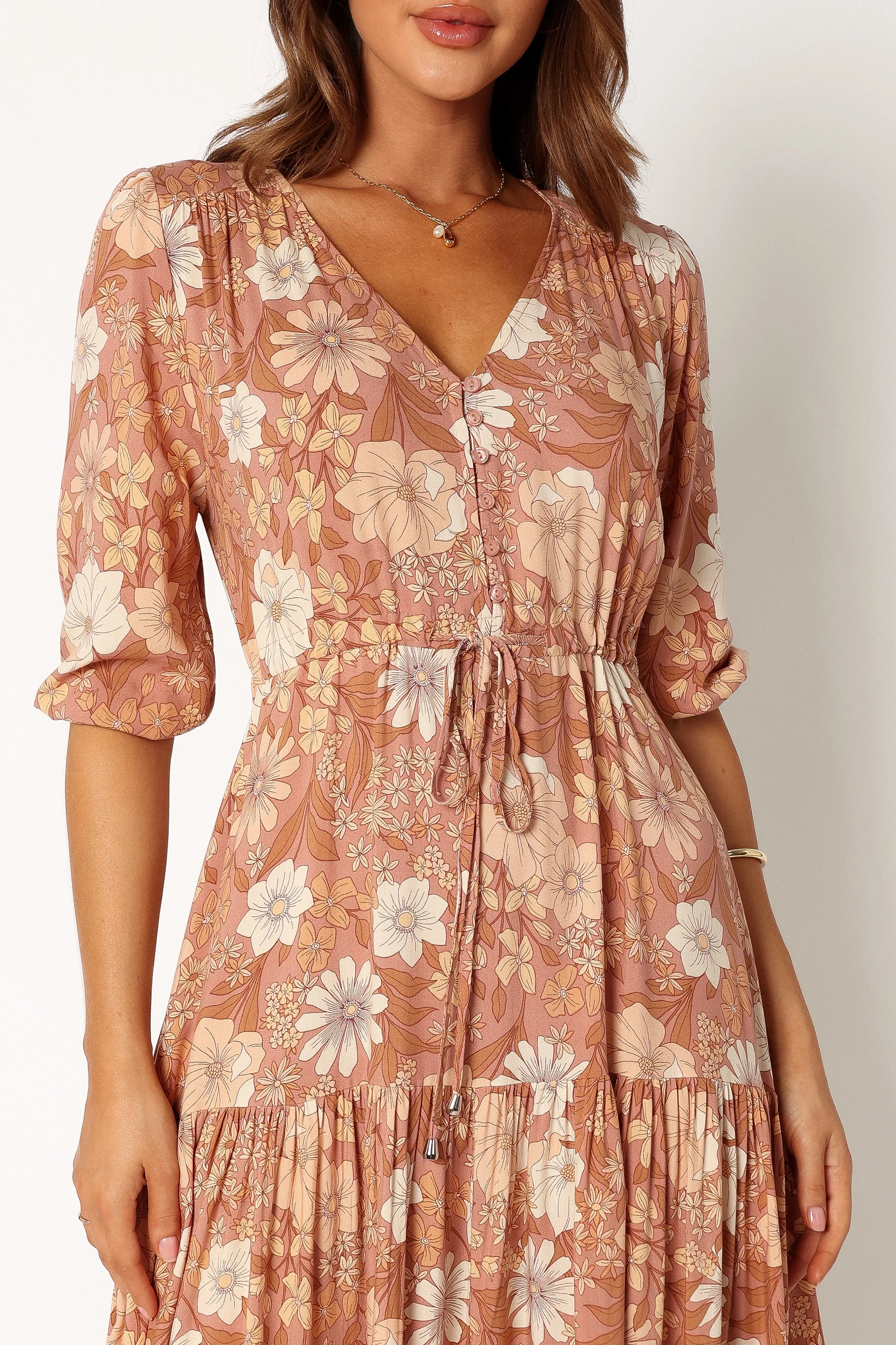 Step out in style wearing this maxi length dress! Featuring a v neckline and mid length sleeves with elasticised cuffs, it's sure to flatter your figure. Functional buttons adorn the bodice, whilst being gathered at the waist with a tie detail for a fun take on femininity. Due to the relaxed fit of this dress, it is recommended if you are between sizes to select a size down.