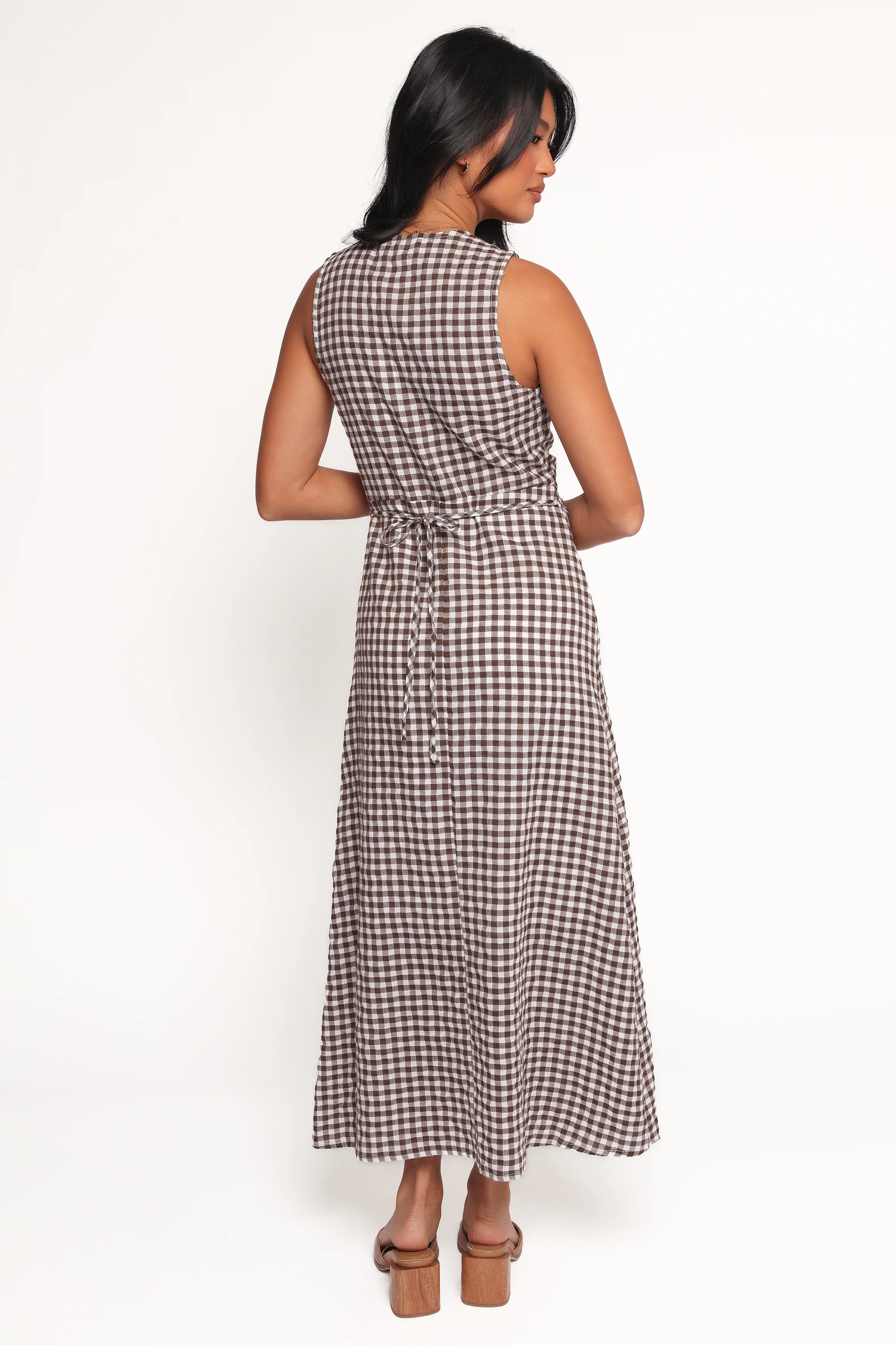 Step up your style game with the Queenie Midi Dress in timeless brown gingham. Designed for ultimate comfort and effortless elegance, this dress features a flattering v-overlay neckline and an empire waistline that perfectly accentuates your silhouette.