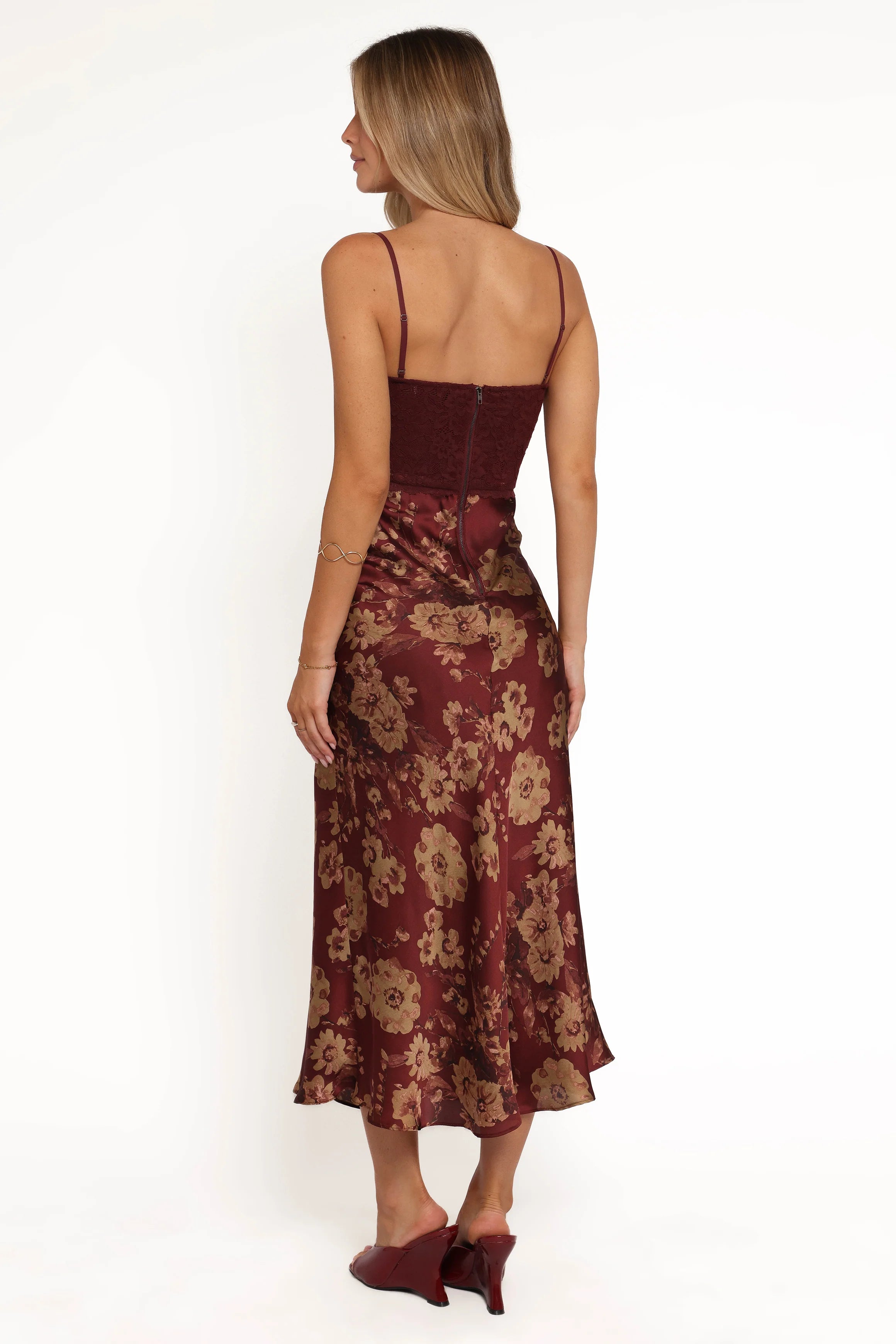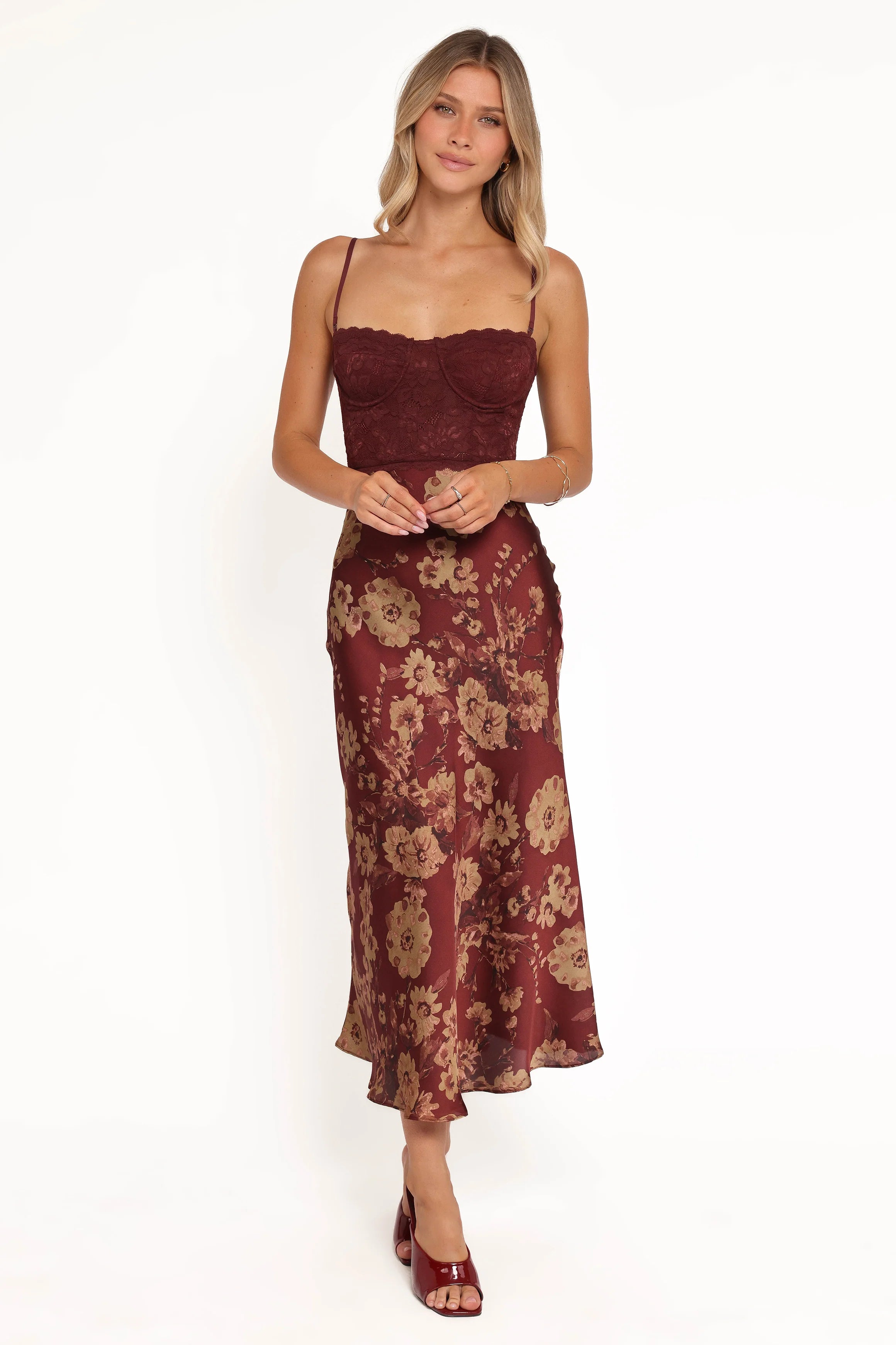 The Shakira Midi Dress in Bronzed Merlot brings romantic elegance with a modern edge. This stunning piece features a flattering straight neckline and supportive underwire cups that create a beautiful silhouette, while removable thin adjustable straps let you customize your fit.